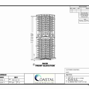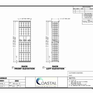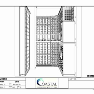 The left sidewall was a little bit of a challenge because of the width of the wine room being as it was. I created a 6 inch deep (as you can see from the side elevation here) horizontal displays to give us the ability to store additional bottles. In this case, 45 more bottles which were laying on their sides with full display.