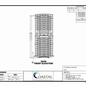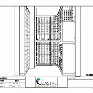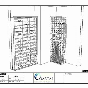 The left sidewall was a little bit of a challenge because of the width of the wine room being as it was. I created a 6 inch deep (as you can see from the side elevation here) horizontal displays to give us the ability to store additional bottles. In this case, 45 more bottles which were laying on their sides with full display.